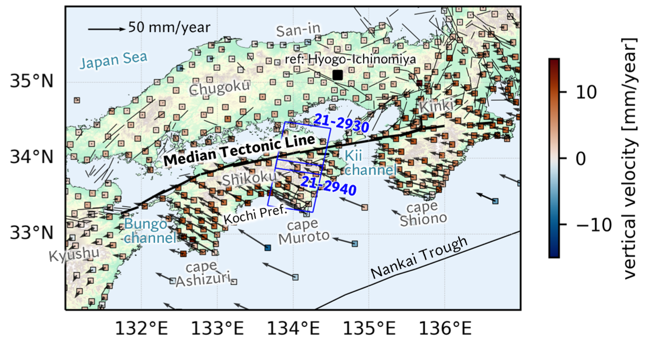 図1 GPS座標値(Takamatsu et al. 2023; Yokota et al. 2018)に基づくGPS点の変位速度場(2014年〜2022年)
