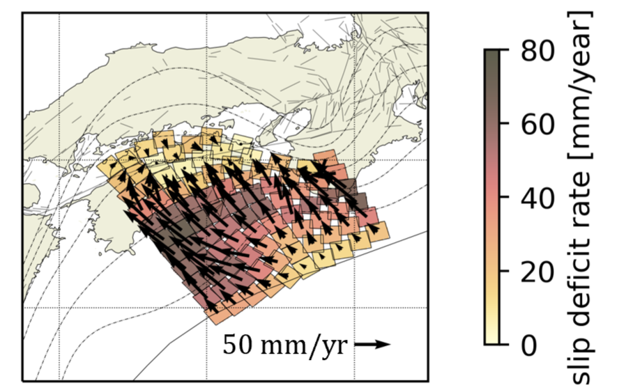 図2 南海プレート沈み込み帯におけるすべり欠損速度(すべり欠損が大きい場所は固着が強い可能性がある)
