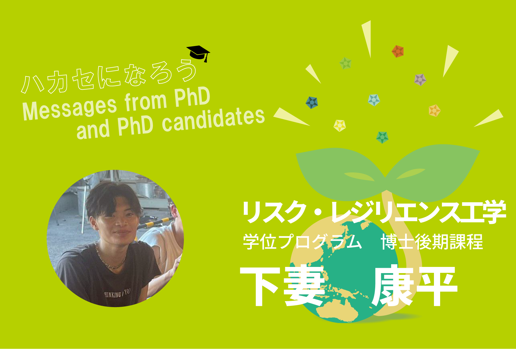 ハカセになろう Messages from PhD and PhD candidates Vol.3 下妻 康平さん(リスク・レジリエンス工学学位プログラム)