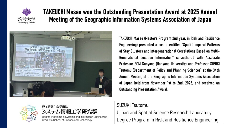 2025/11/07AwardsRisk and Resilience EngineeringTAKEUCHI Masao won the Outstanding Presentation Award at 2025 Annual Meeting of the Geographic Information Systems Association of Japan
