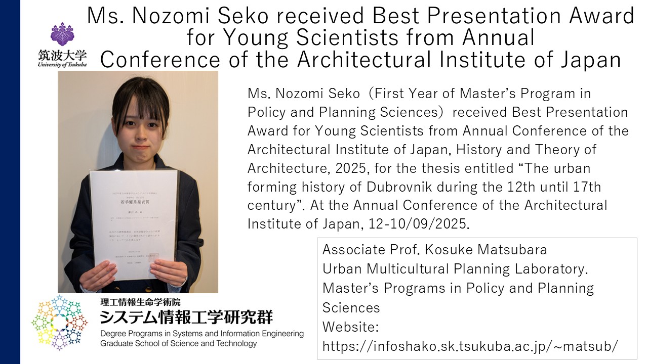 2026/01/23AwardsPolicy and Planning SciencesMs. Nozomi Seko received Best Presentation Award for Young Scientists from Annual Conference of the Architectural Institute of Japanhttps://infoshako.sk.tsukuba.ac.jp/~matsub/