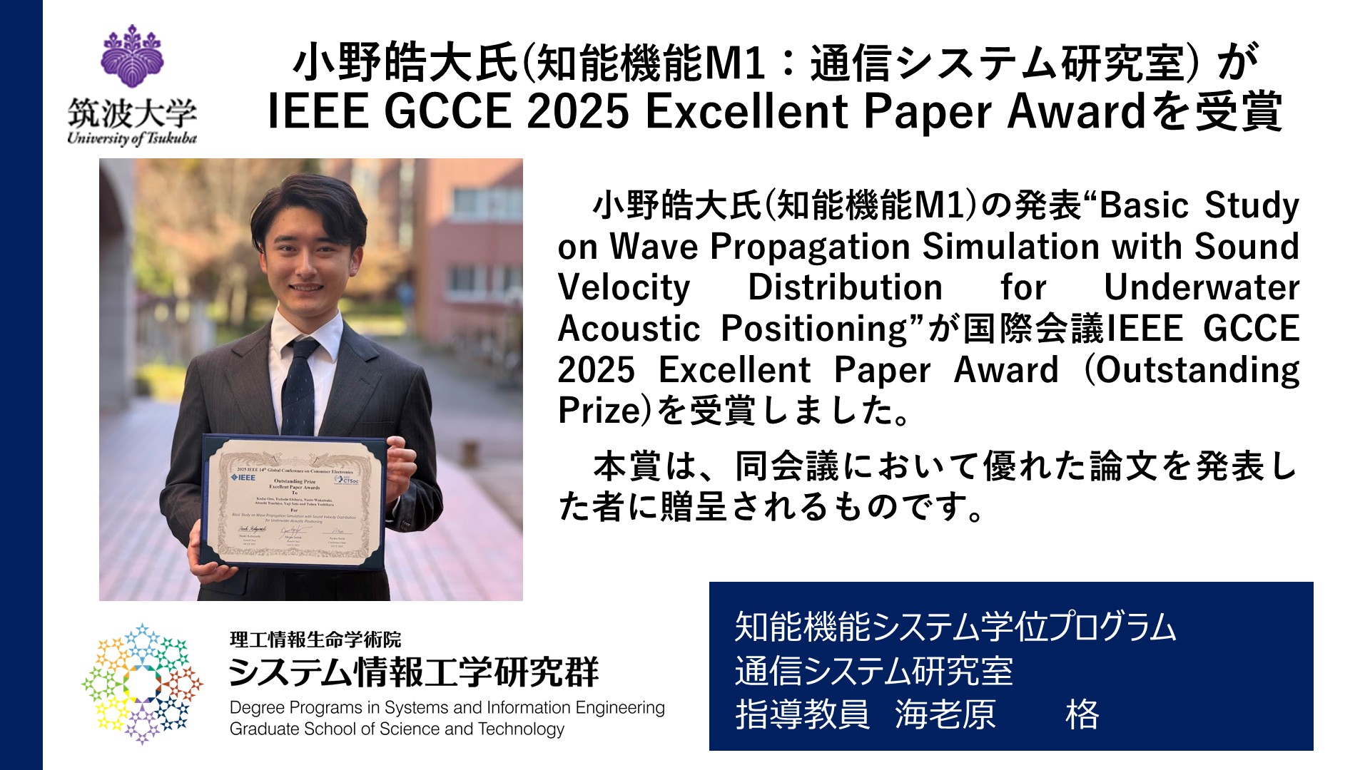 小野皓大氏(知能機能M1:通信システム研究室)がIEEE GCCE 2025 Excellent Paper Awardを受賞