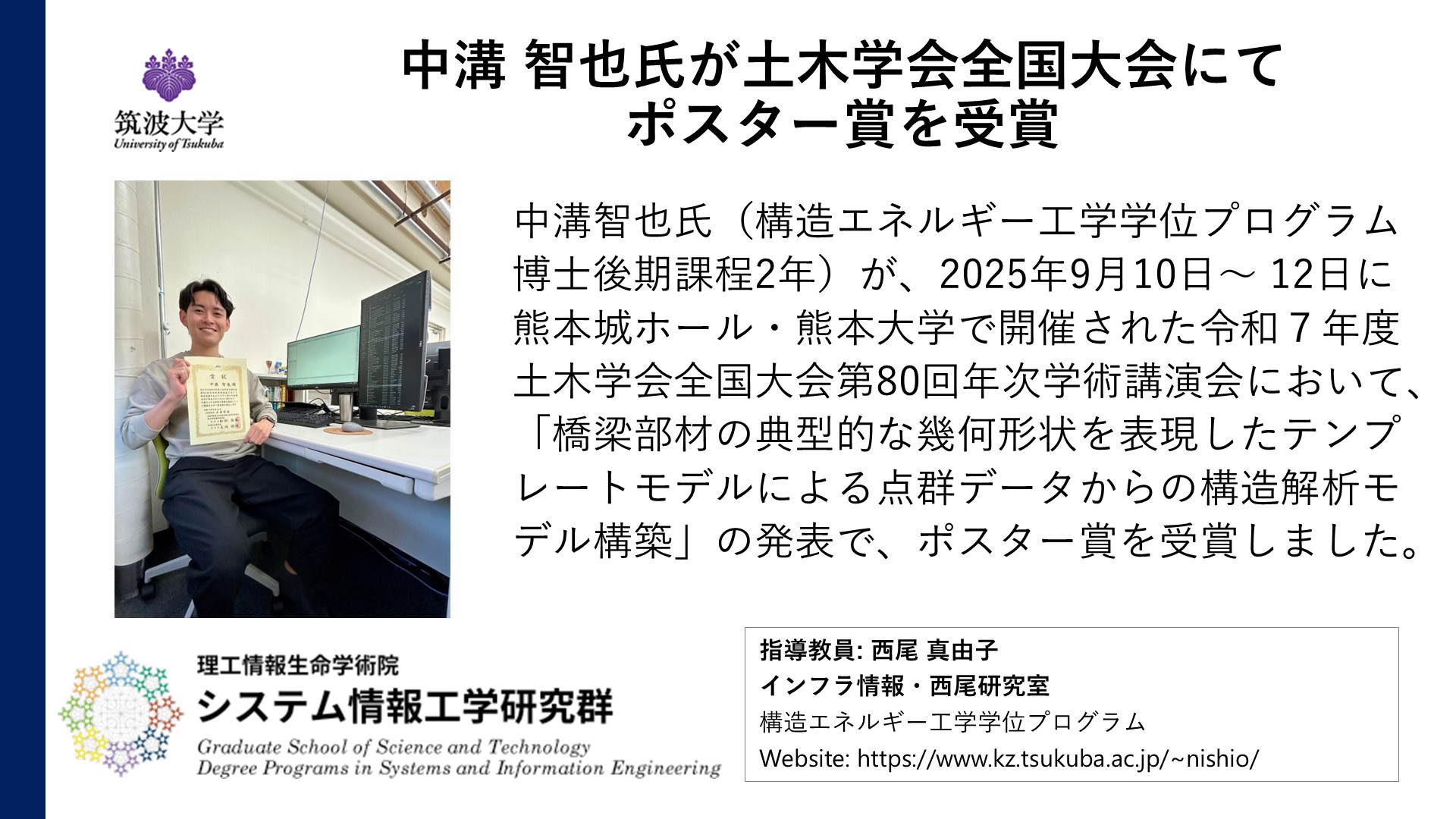 中溝智也氏が土木学会全国大会にてポスター賞を受賞