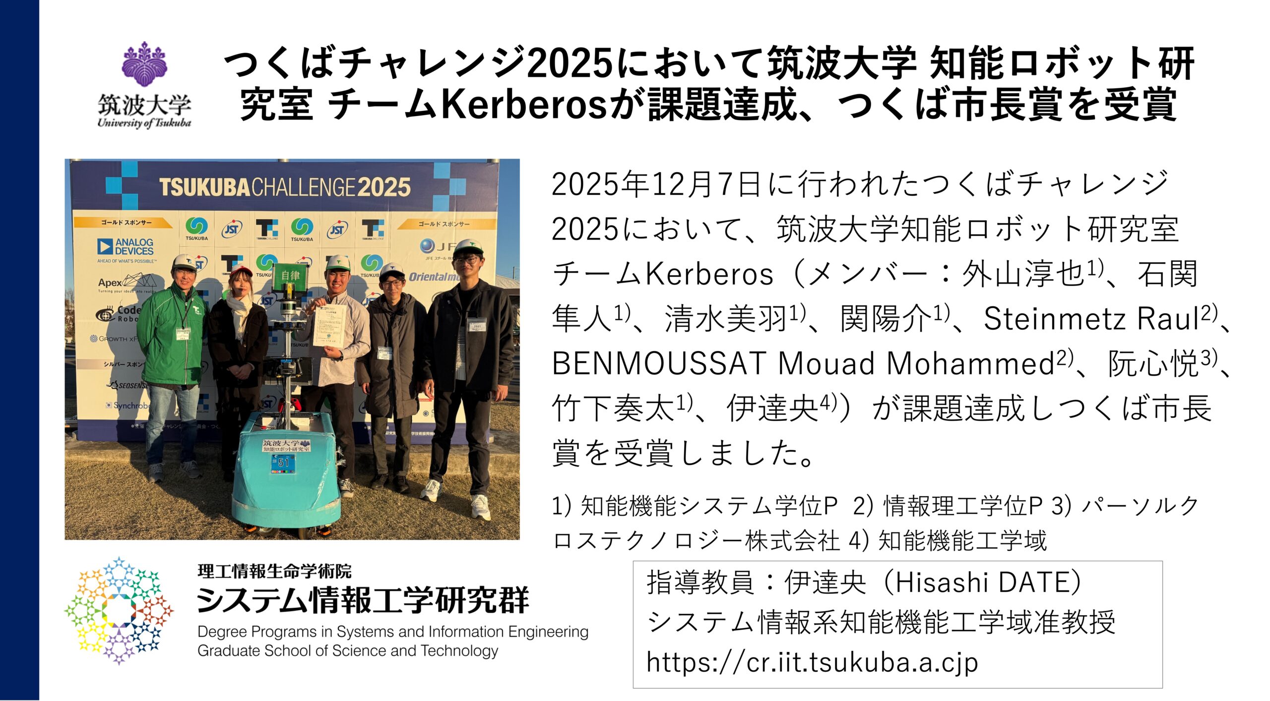 2026/01/16受賞・表彰知能機能システムつくばチャレンジ2025において筑波大学知能ロボット研究室チームKerberosが課題達成、つくば市長賞を受賞https://cr.iit.tsukuba.ac.jp
