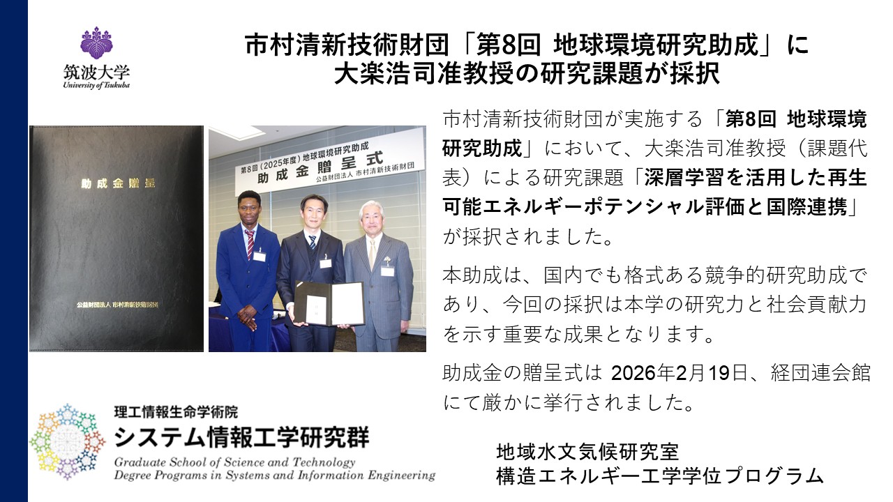 市村清新技術財団「第8回 地球環境研究助成」に大楽浩司准教授の研究課題が採択