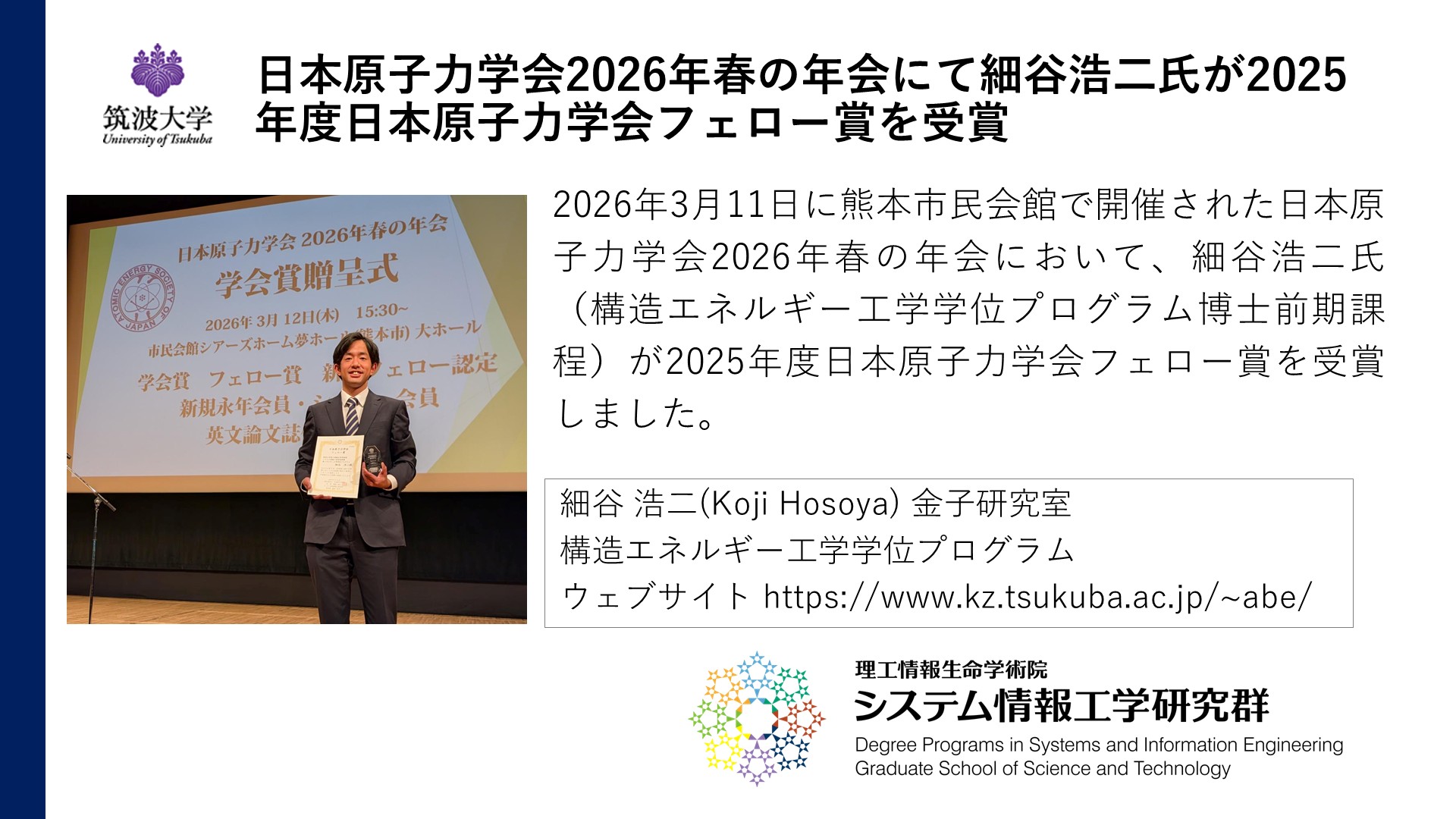 2026/03/17受賞・表彰構造エネルギー工学日本原子力学会2026年春の年会にて細谷浩二氏が2025年度日本原子力学会フェロー賞を受賞https://www.kz.tsukuba.ac.jp/~abe/