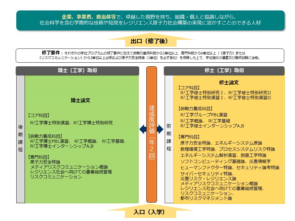 これらの人材養成目的を達成するため、本プログラムに教育課程「レジリエンス原子力コース」を設け、リスク・レジリエンス学に関する学際的な技術や知見と高度な技能・実践力のみならず、人間力をも身に付け、原子力による現実社会の問題を見据えて、社会で活躍することのできる原子力規制人材を、産学官連携協働の下で育成します。