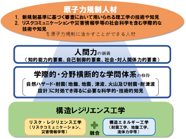 地震・津波のメカニズムを記述する固体力学・流体力学等の自然科学や耐震工学・都市リスク等の減災・防災に関する理工学の技術や知見を、原子力規制をはじめとする、原子力を安全安心に用いた持続可能でレジリエントな社会(レジリエンス原子力社会)の基盤策定に活かすことのできる人材(主に構造エネルギー工学学位プログラムの学生を想定)